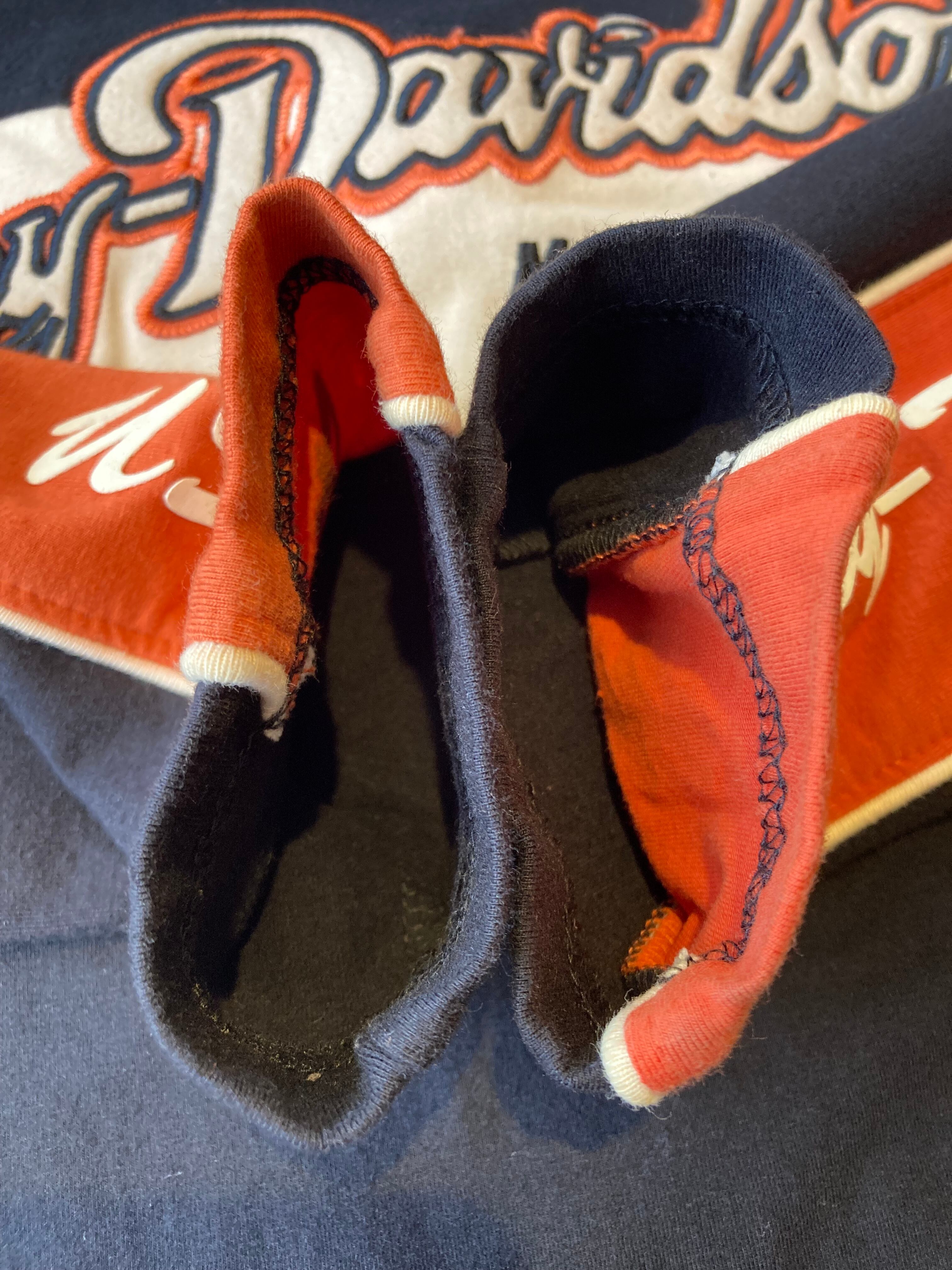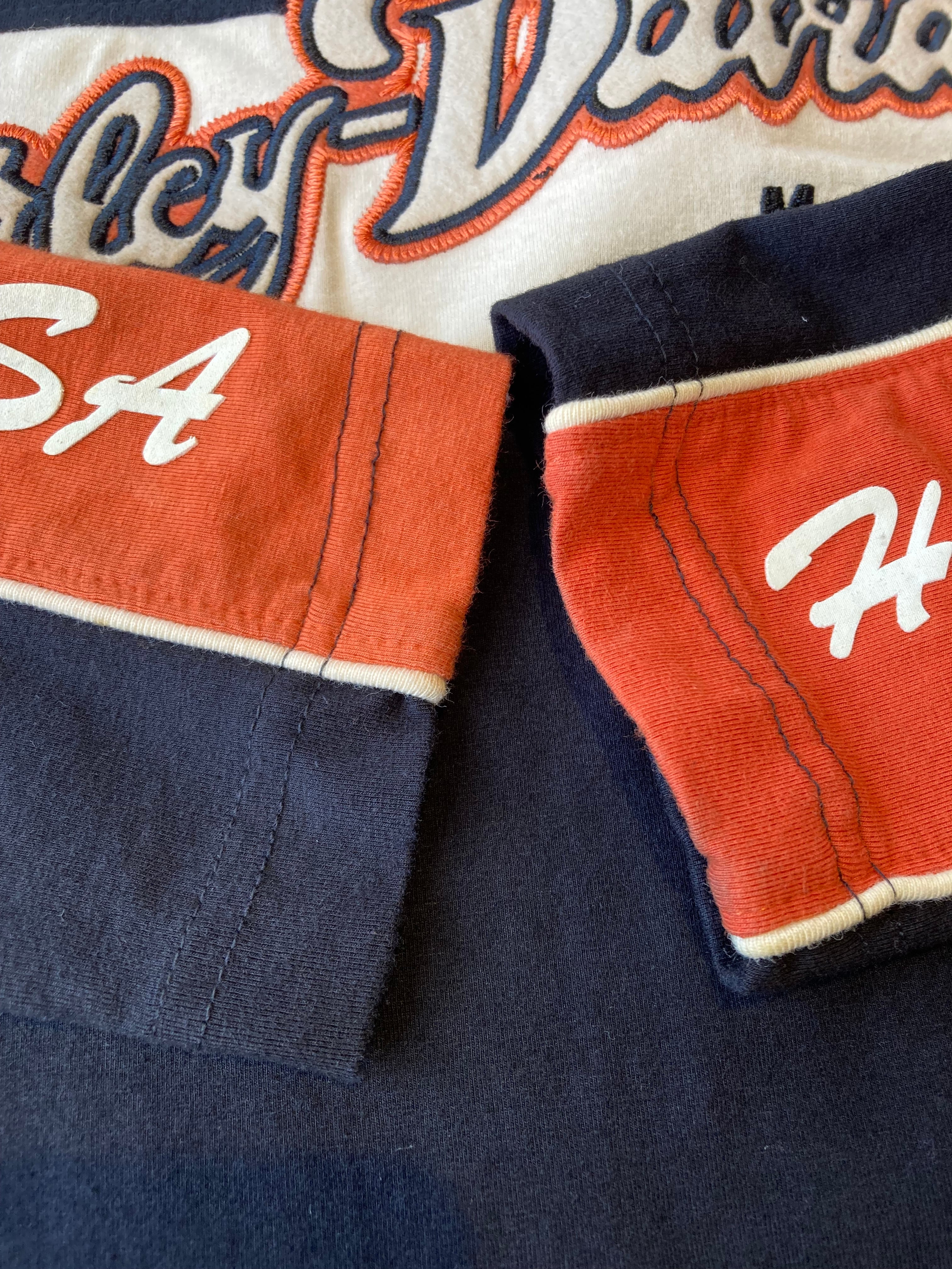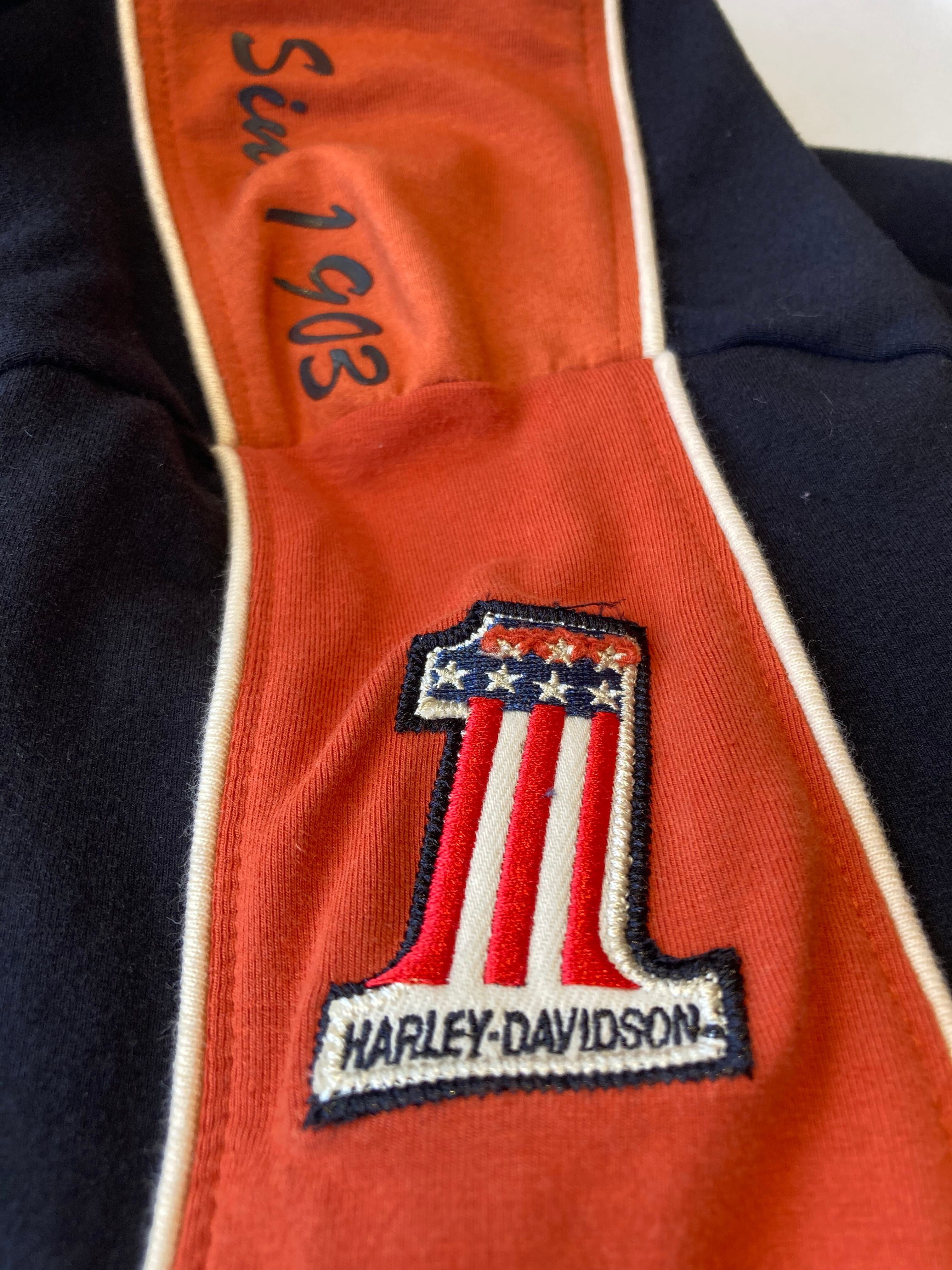 フロントのフェルトワッペン、バックには刺繍とシールド◎肩、両腕に刺繍と立体的なラバプリが施されています。さすがハーレー。エンブレムとナンバーワンはやっぱカッコいいですね。