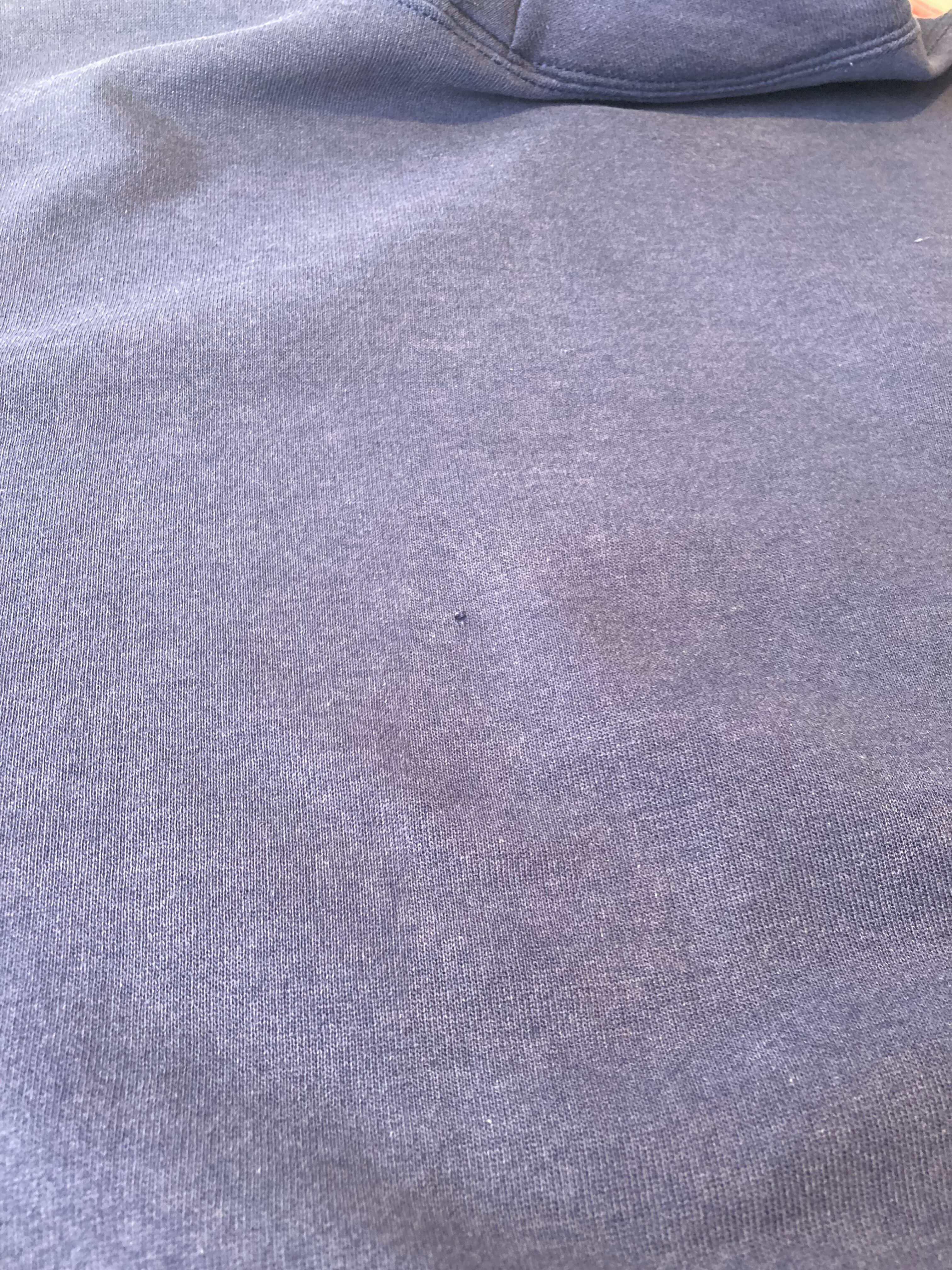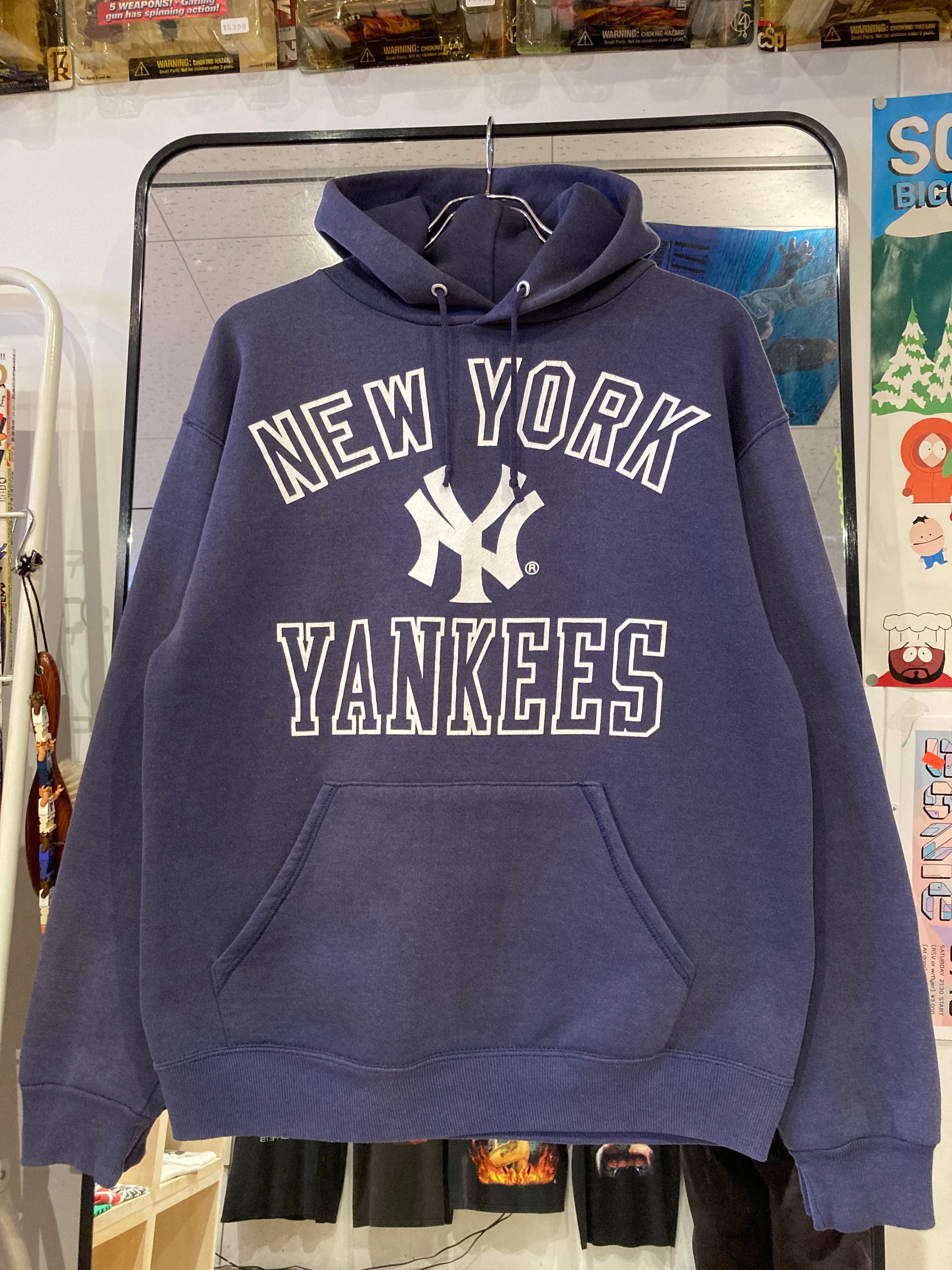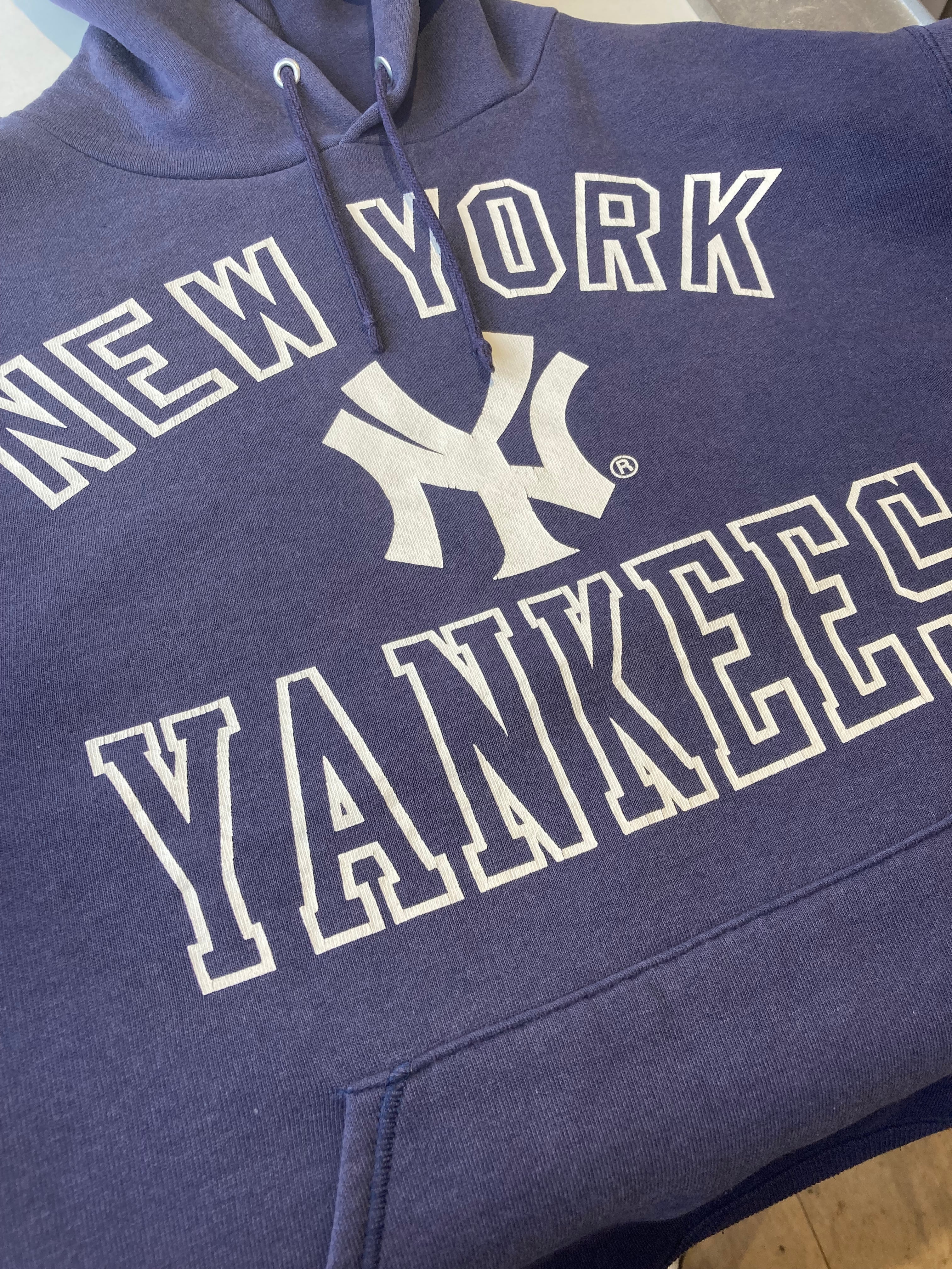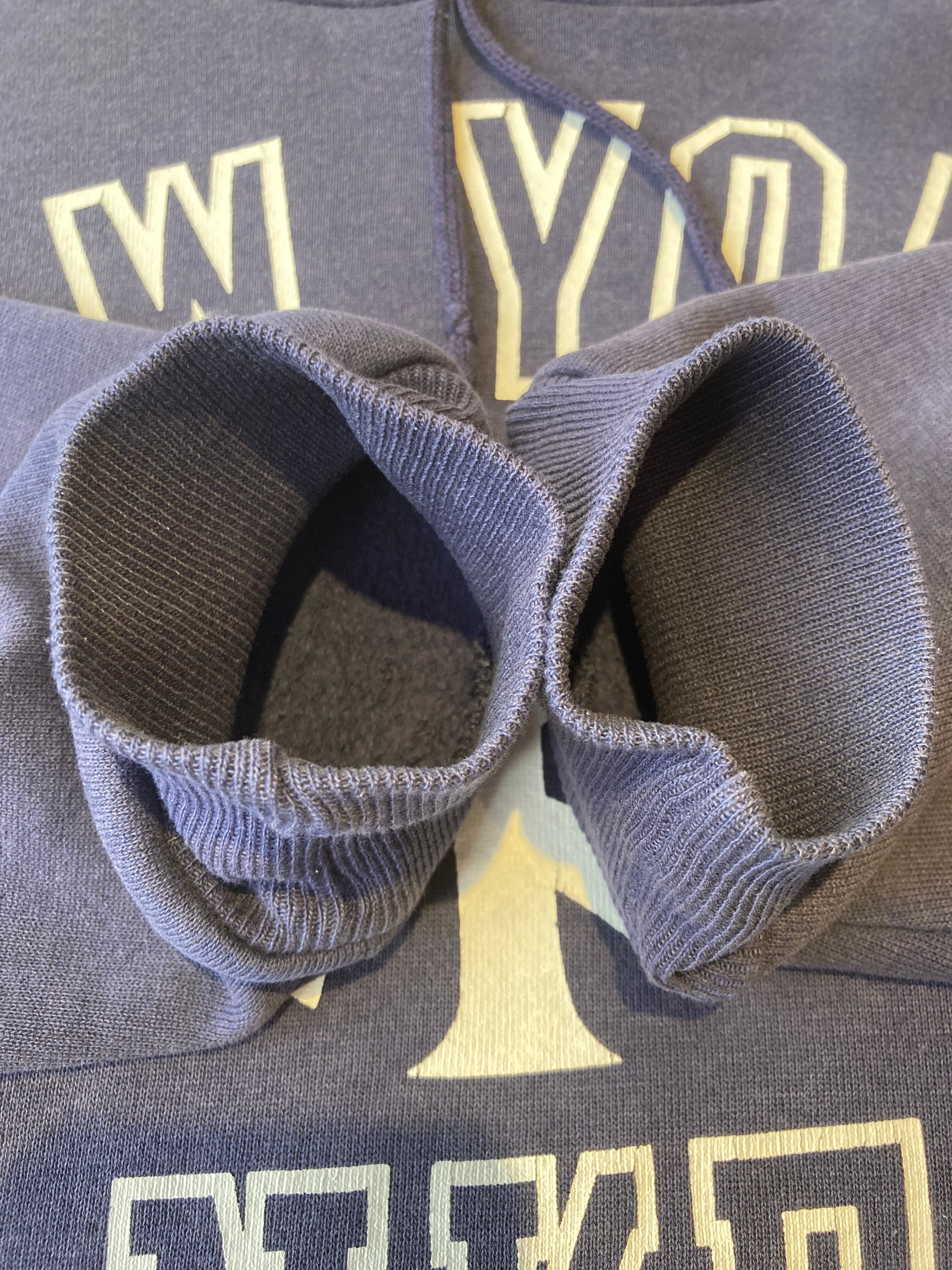 定番にして王道のヤンキース プルオーバーパーカー!!この辺りも狙って探すとなかなか良いパーカーが見つからないですが、コチラはアーチ3段 (って他の人は多分言わないですが) の豪華なインパクト大な一枚◎芸術的なナス紺フェードも組み合わさったスペシャルなレギュラー。