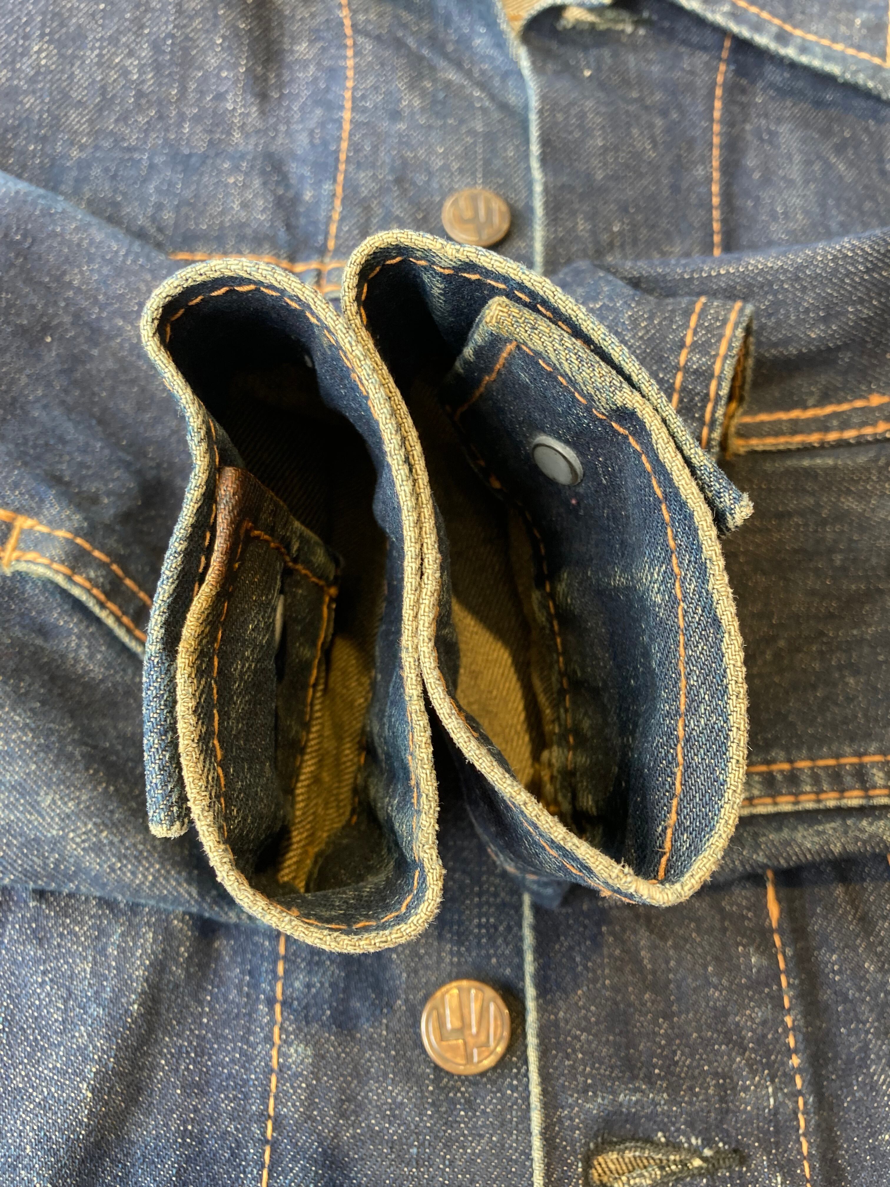 そこそこ古そうなブランド不明のトラッカージャケットです。ストアブランドっぽい感じもします。写真だと伝わりにくいのですが、とにかくデニムの感じが良いんです◎アタリとハチノスの感じが既に期待感大。