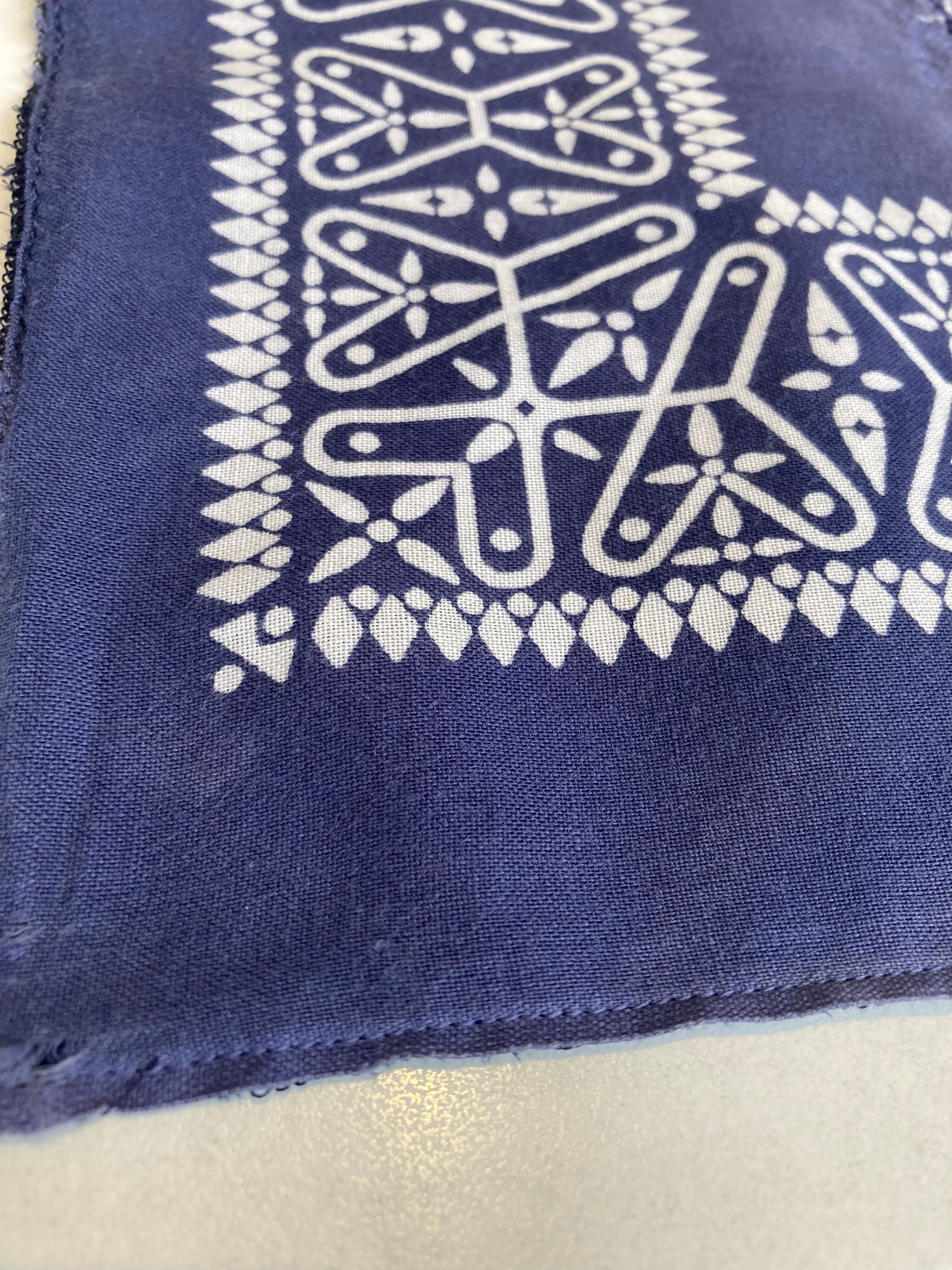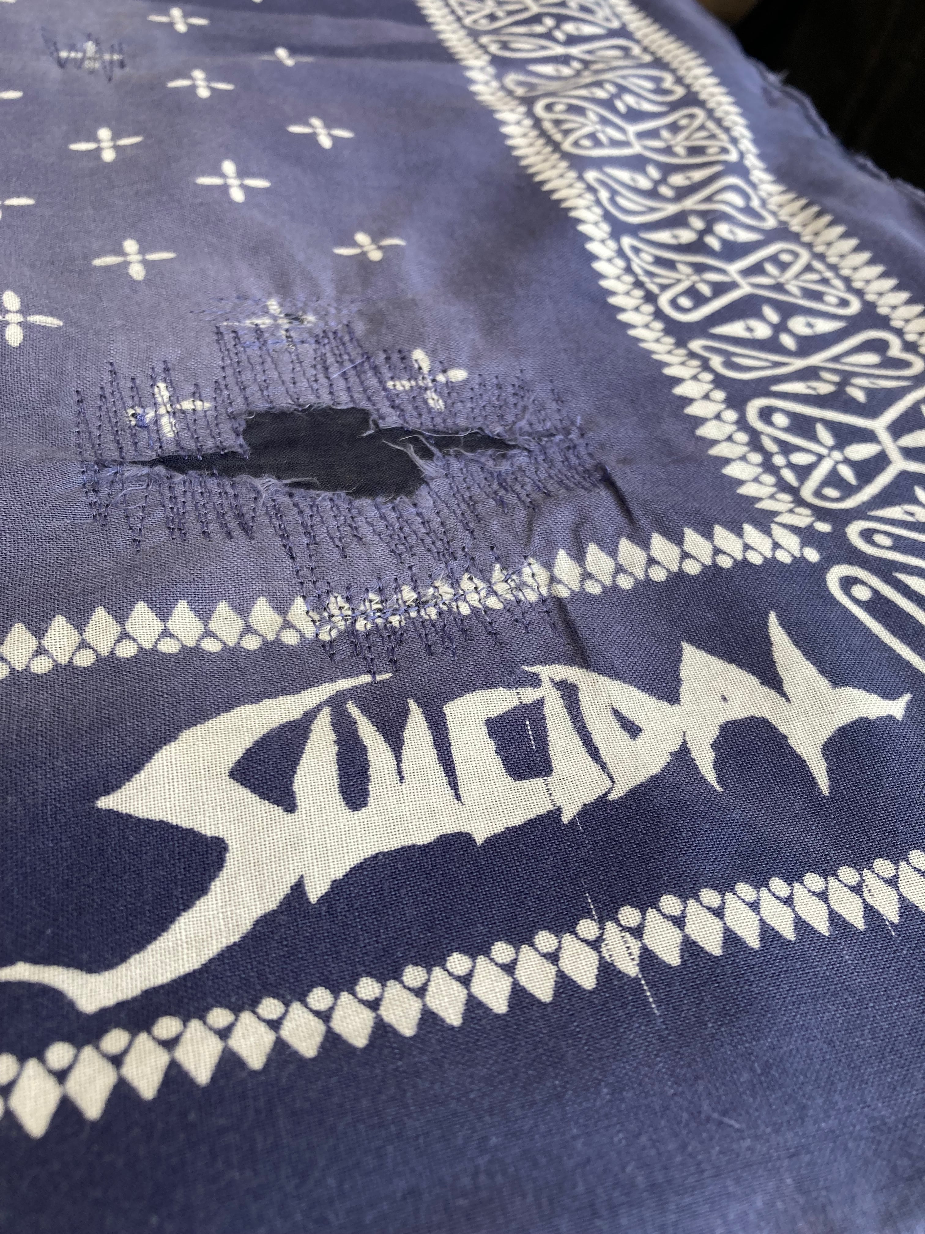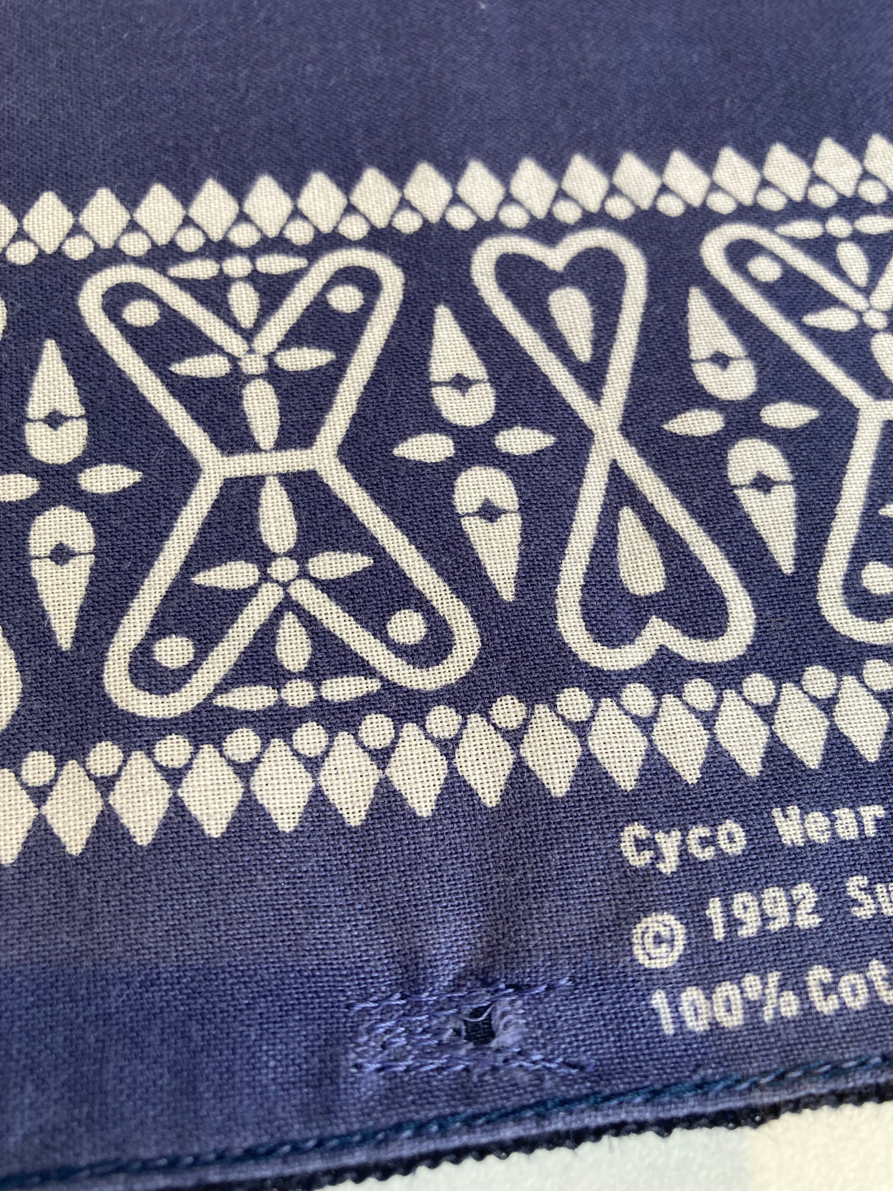 復刻もされていますが、コチラは90's U.S.A 製のチョ〜フェードの効いたアーリーな一枚◎愛用されていた為か、ダメージがありましたがお直し屋さんにてしっかりリペアして頂きました。バンダナを当ててもよかったのですが、厚さが倍になると使いづらいと思い、四方を薄手のポリ生地で裏から縫って貰っています。