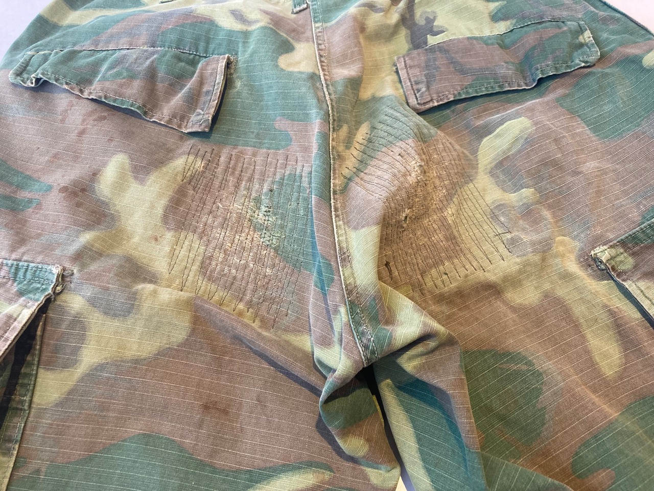 NAM戦時に採用、支給されていたERDLカモ柄(通称リーフカモ)野戦パンツです。色調はグリーンリーフ又は初期リーフと呼ばれるグリーンの色調が強いタイプです。