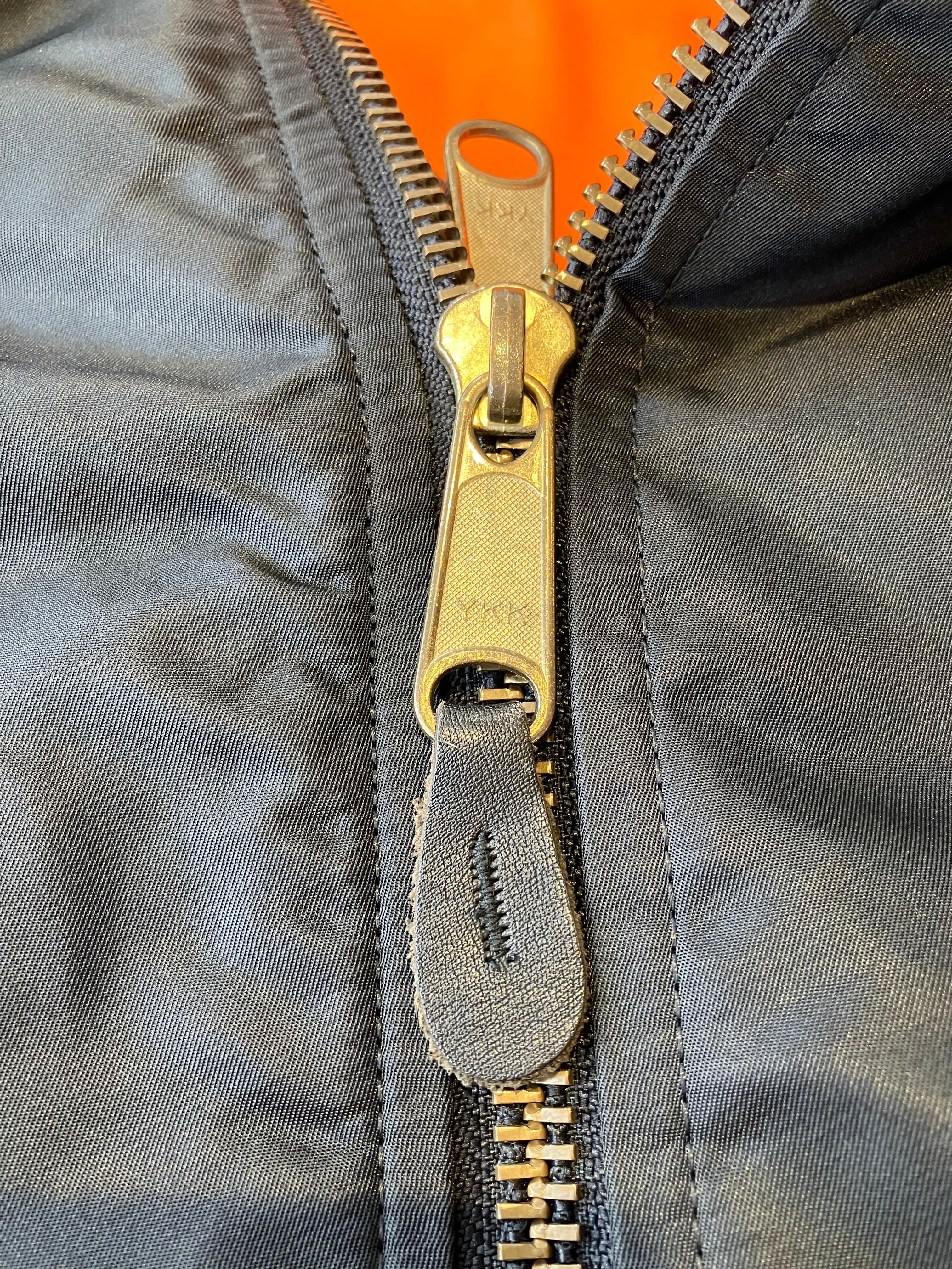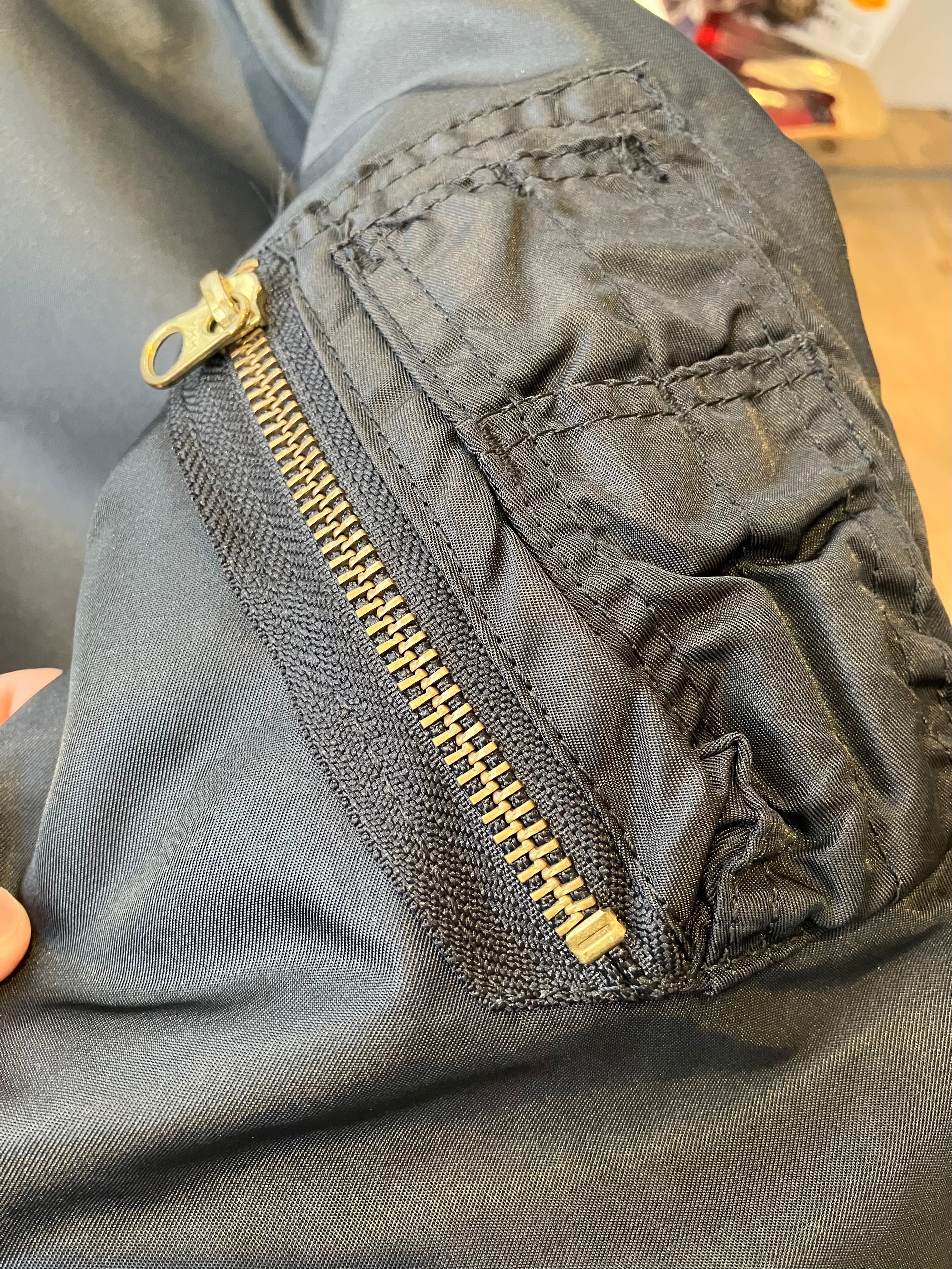 90's MA-1 です。写真では伝わりにくいのですが、リブ部分のブラックの色がボディーと若干異なる2トーンの様な色合いが◎ゴリゴリなミリタリー感が苦手な方は着やすいカラーでオススメ。