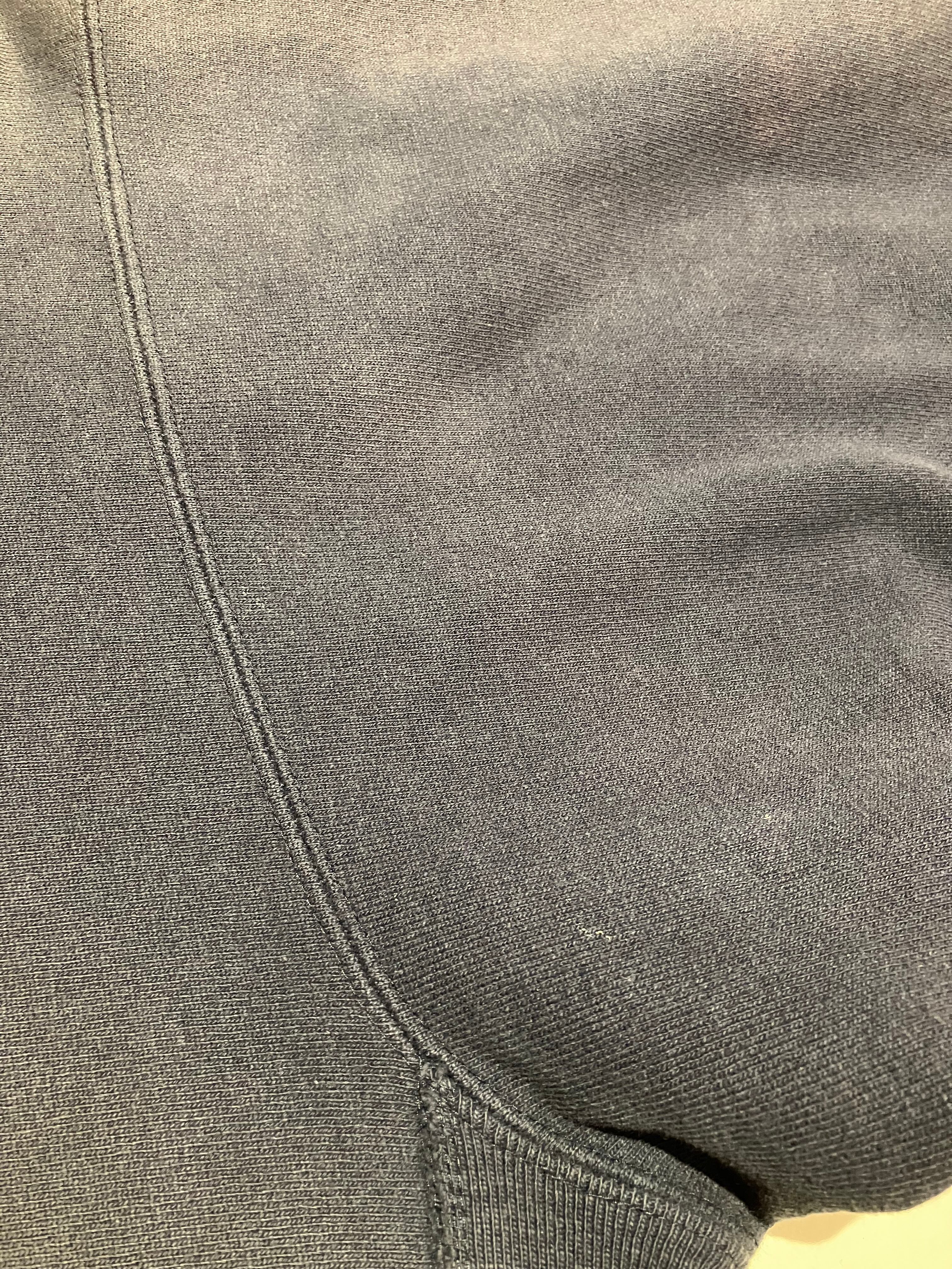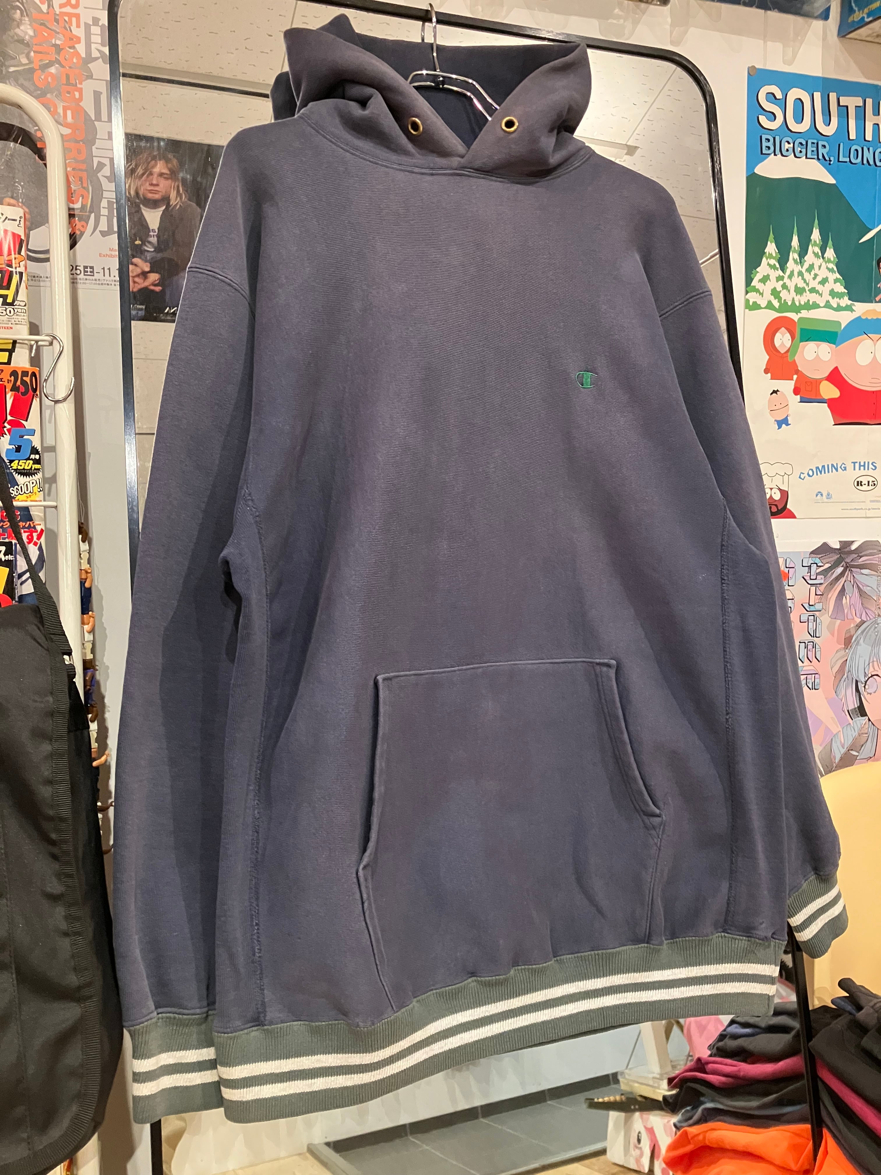 久々に良いリバースウィーブが入荷しています。90's Championリバースパーカーのリブボーダータイプ。ソリッドよりも近年出会わなくなって来た印象のシリーズ。フェードしたナス紺カラーが最高かと◎