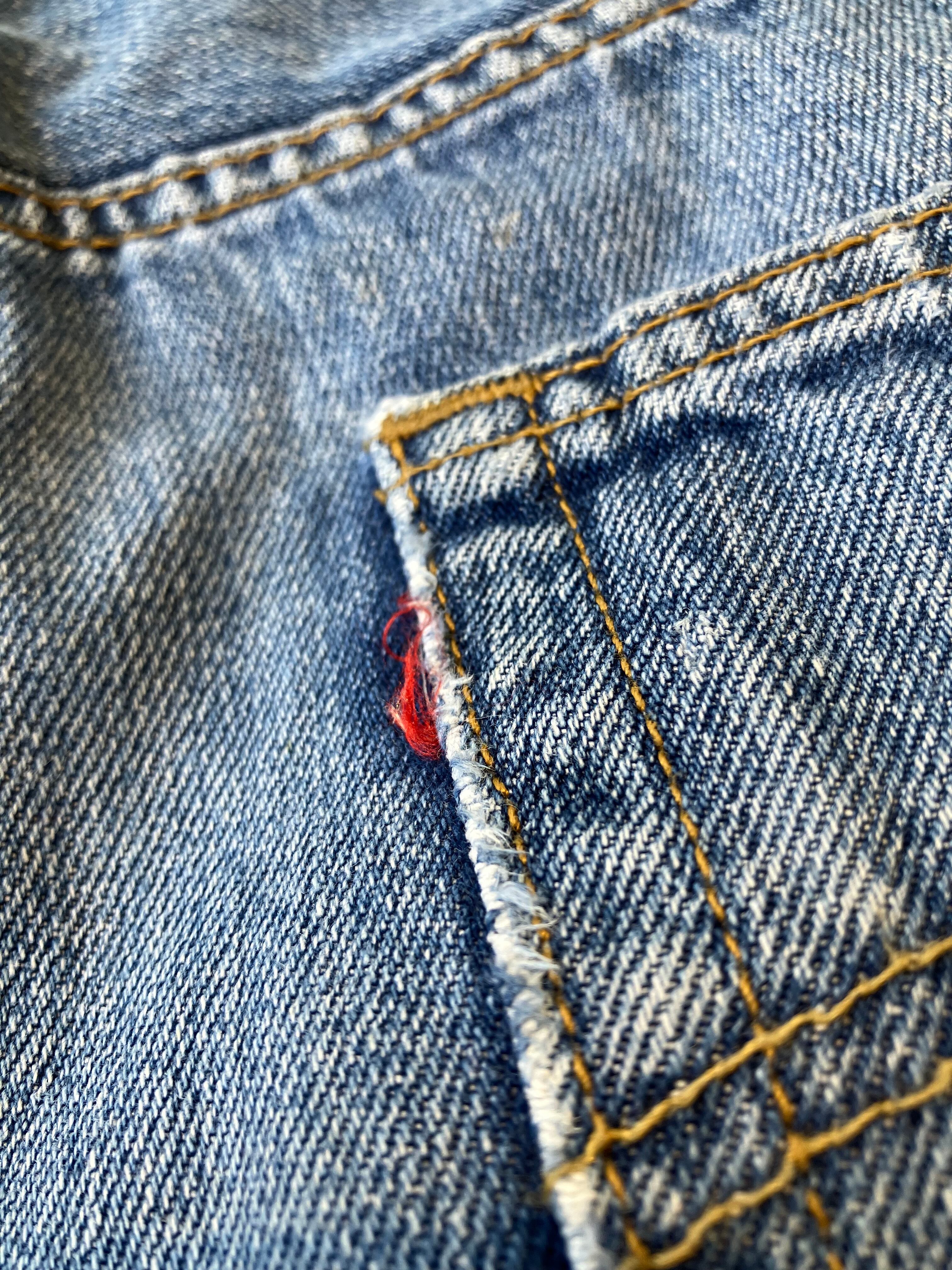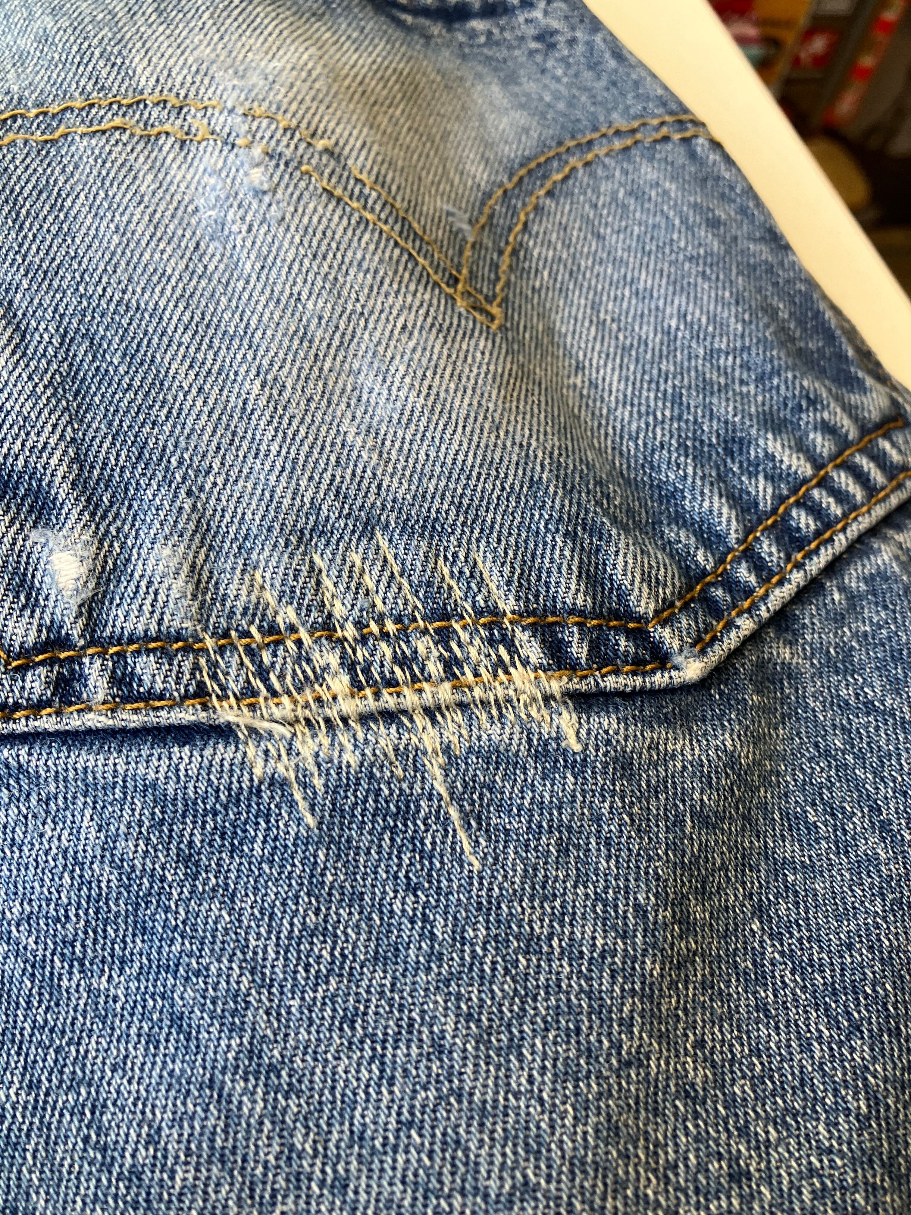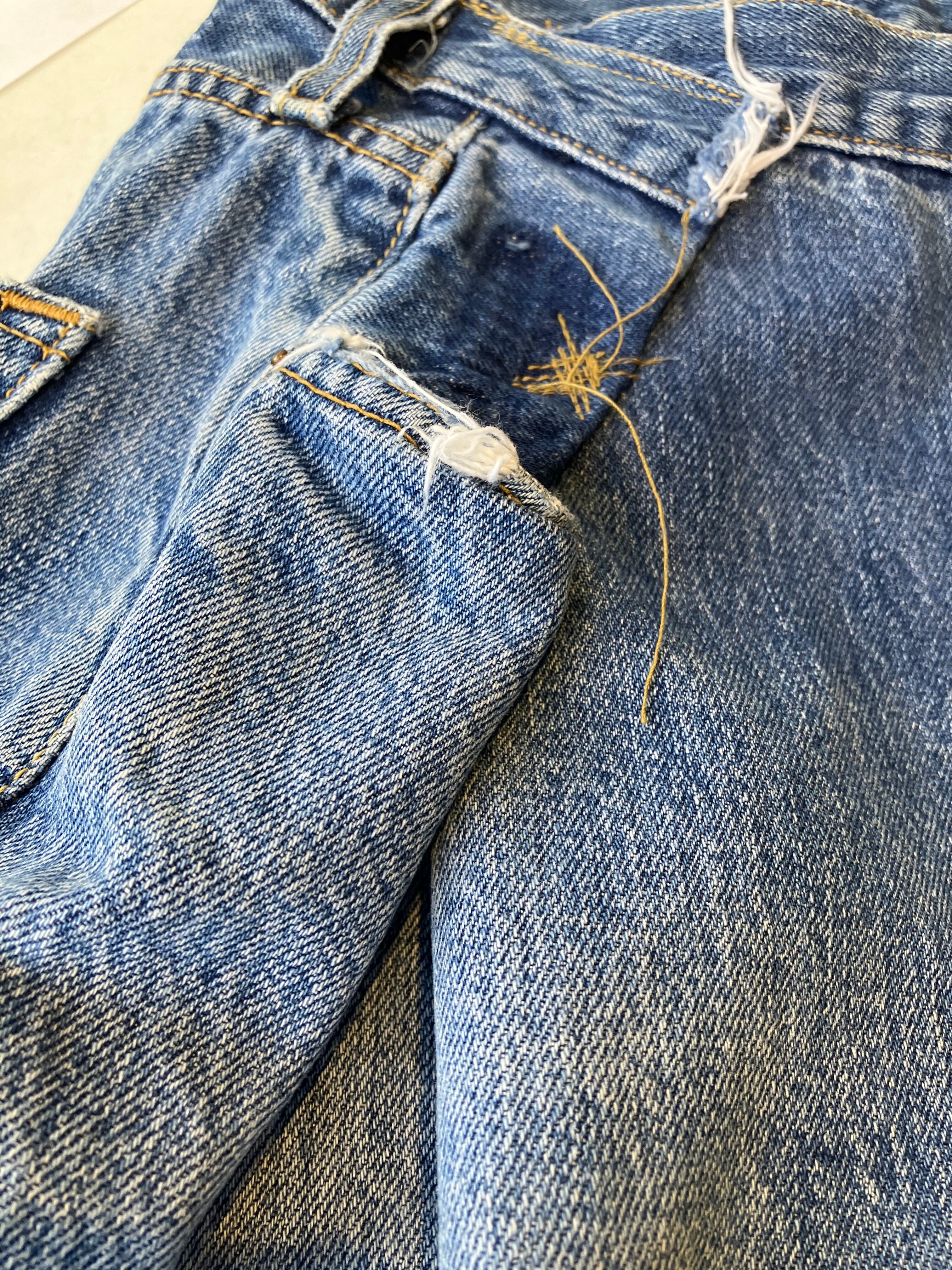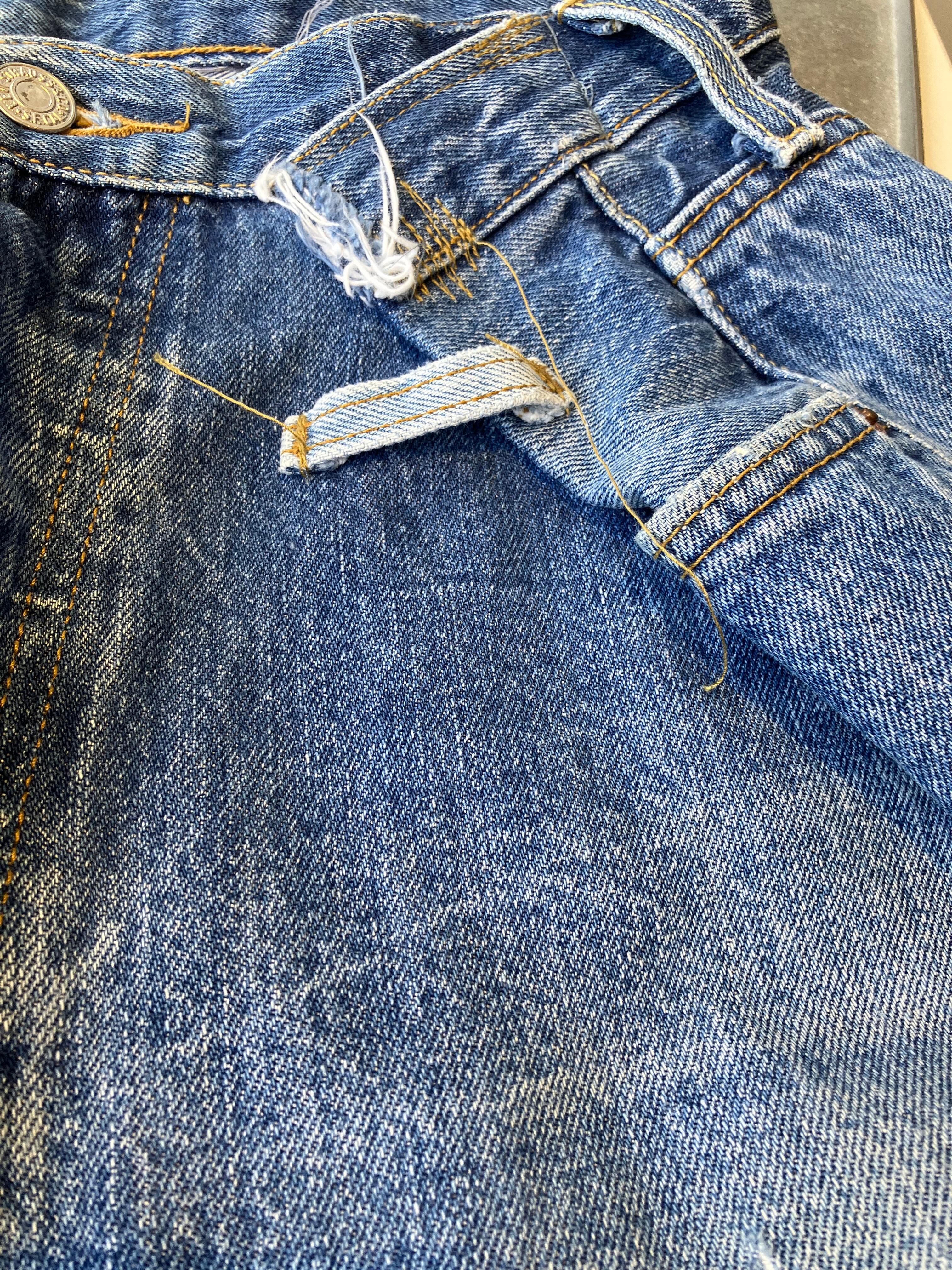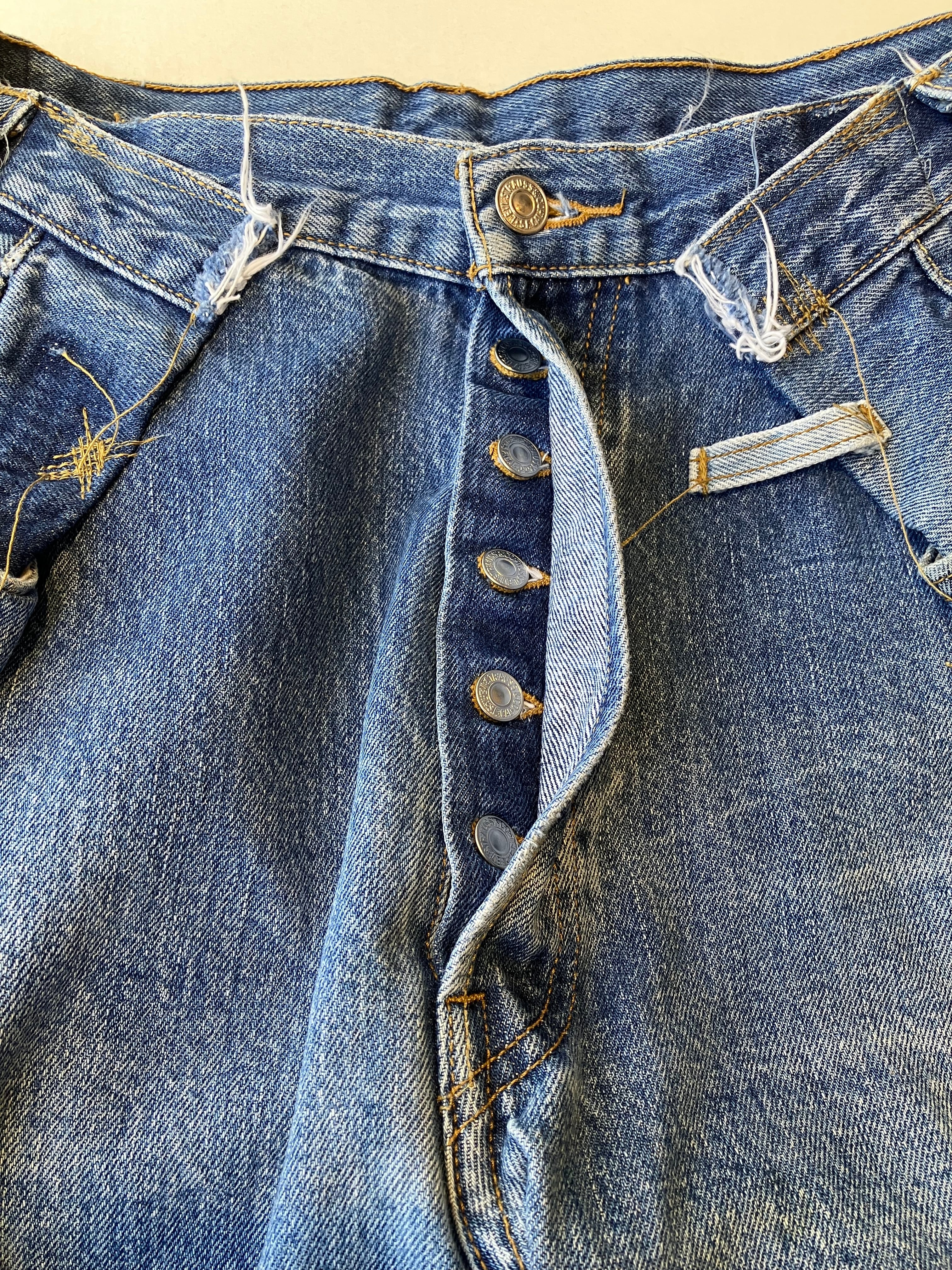 ブランド不明のリメイクデニム。501をベースに、大胆なタックを入れた様なデザインが◎