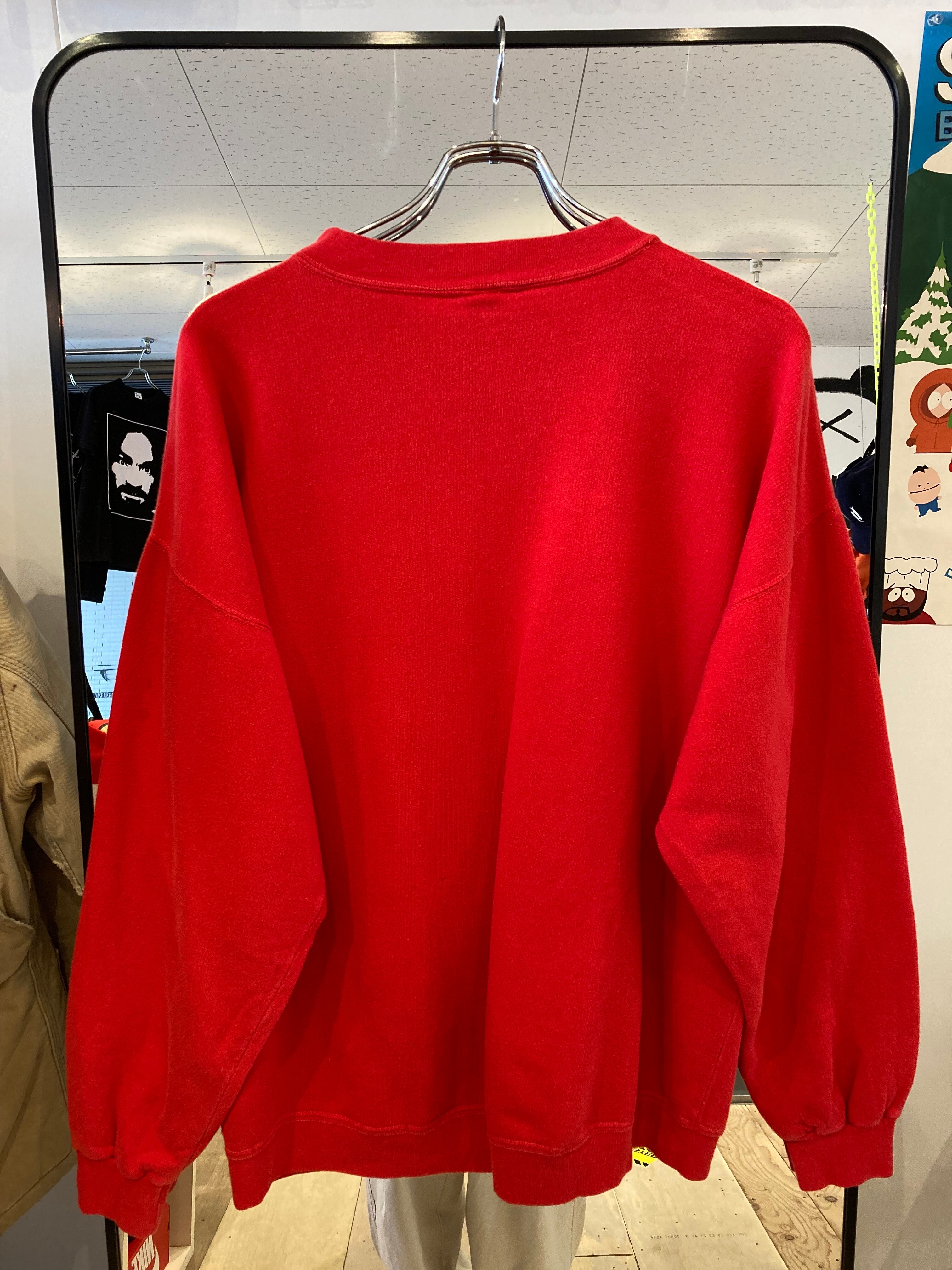 ちょっと古そうなイカしたジャーマンプリントのスウェット。セットインスリーブでゆったり肩の落ちるシルエットが最高な一枚です。赤ってハードル高そうなイメージですが、プリントがイカしてるんで無問題かと。フォントもイイ感じ!オススメです!実物の方がもう少し褪色しています。