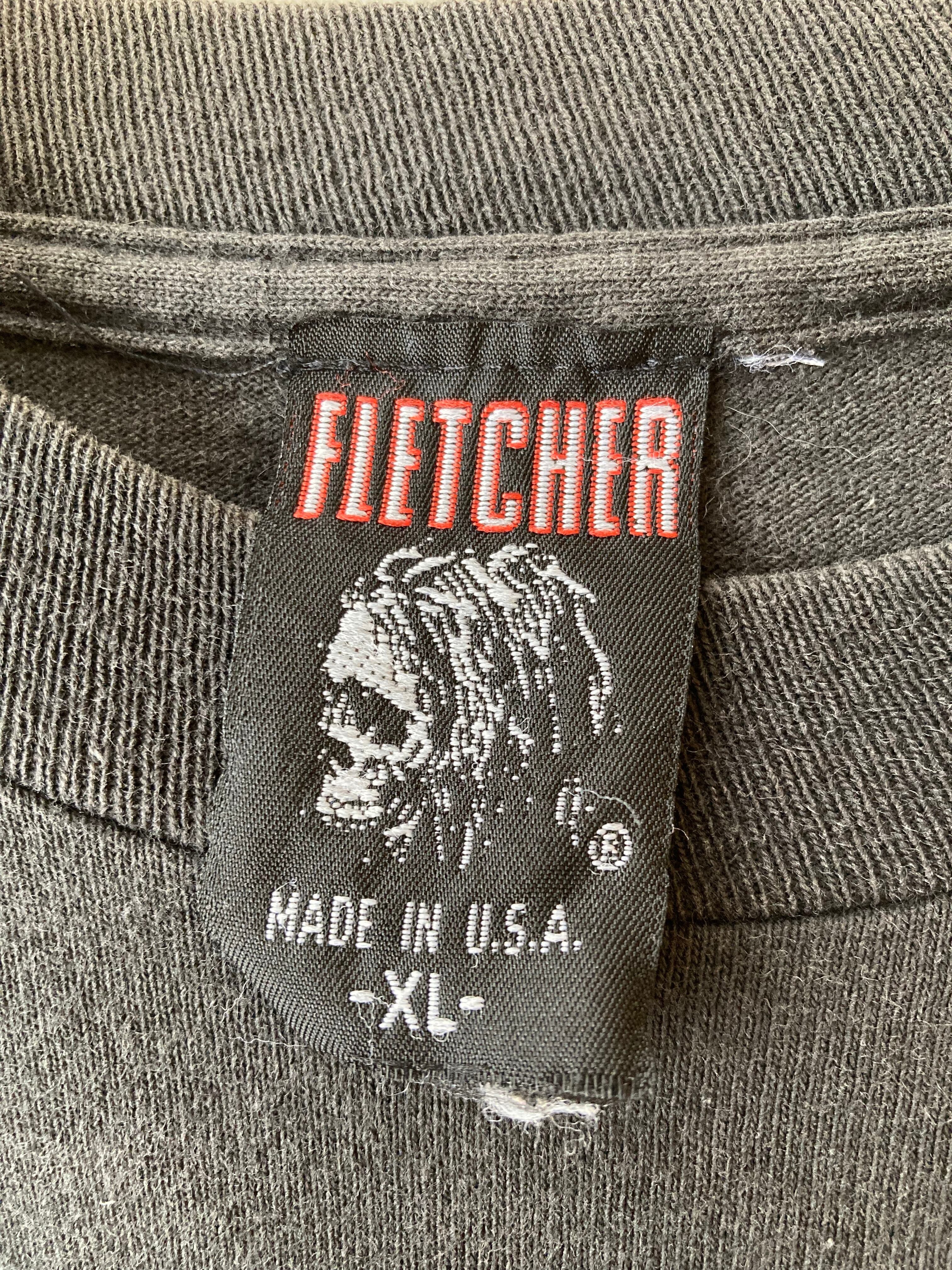 久々、フレッチャーのTシャツです。昔は度々出会えましたが、めっきり出会えなくなりました稀少なXL。墨黒ボディーがなんともCOOLです。フロントにお馴染みのCFロゴ、バックにスカルクロスと文句無しのデザイン。リペアもありますが、フェードと併せて良い雰囲気を醸し出しています。