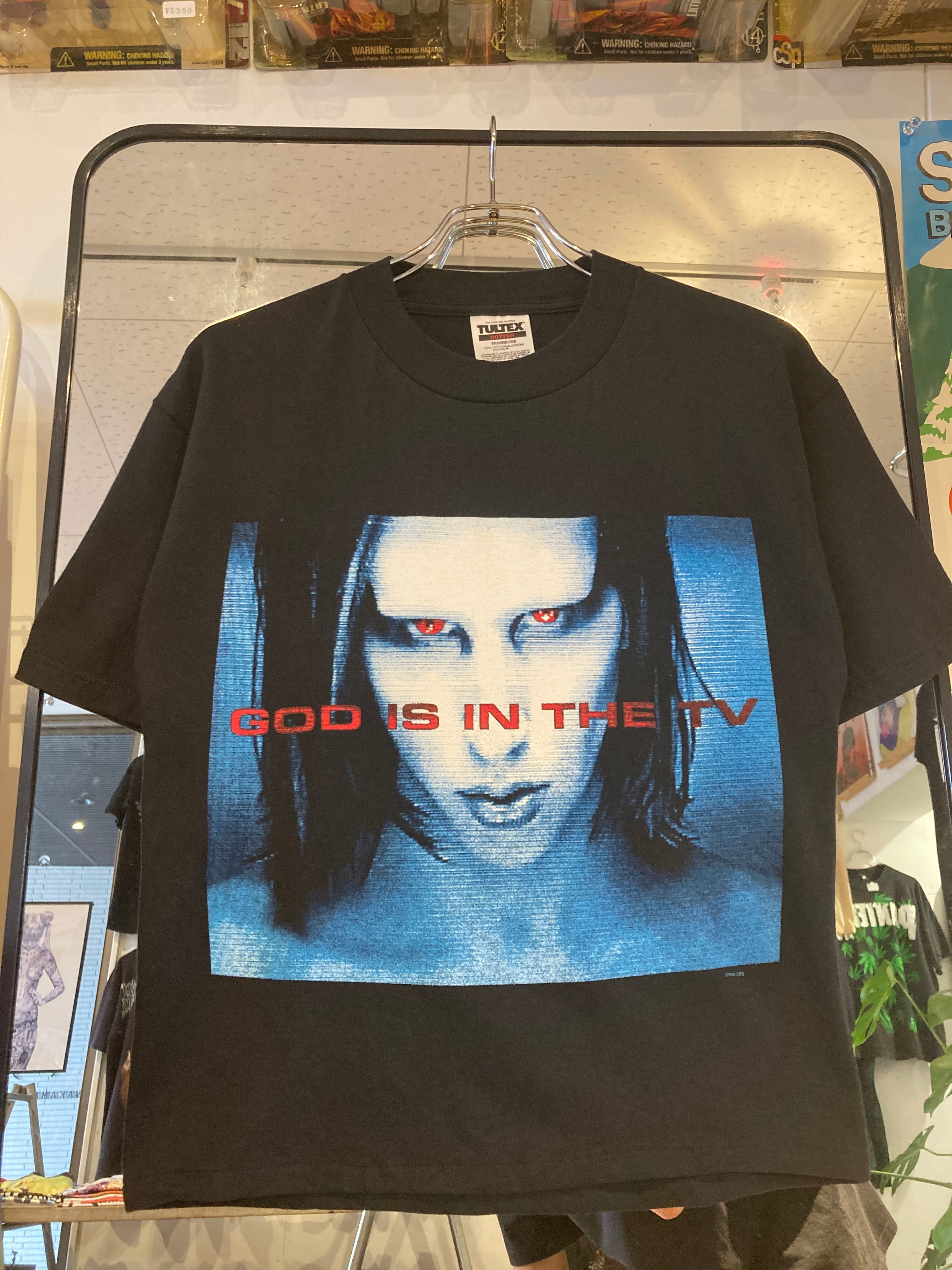 ロックTシャツの中でもトップクラスの人気&高騰を続けているマリリン・マンソン。コチラは2作目のライブビデオ、god is in the tvのTシャツ。Mechanical Animals、The Beautiful Monsters Tour、Rock Is Deadが収録されています。