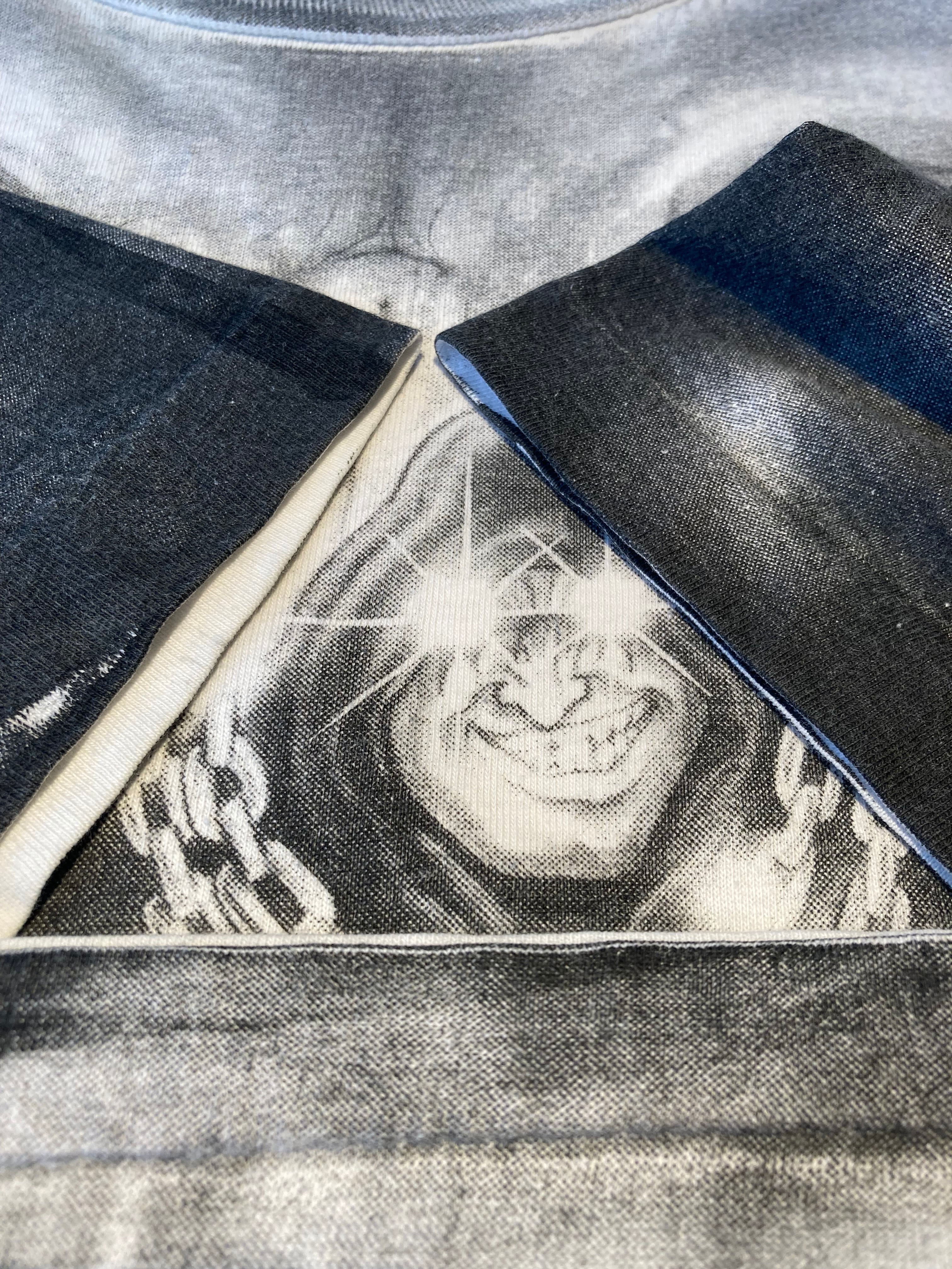 90's 死神 Tシャツです。リブから袖にまで掛かる大版はモスキートヘッドみたいで最高な一枚◎死神のこのシリーズは数多く存在しますが、個人的にはかなり良いデザイン個体かと思います。