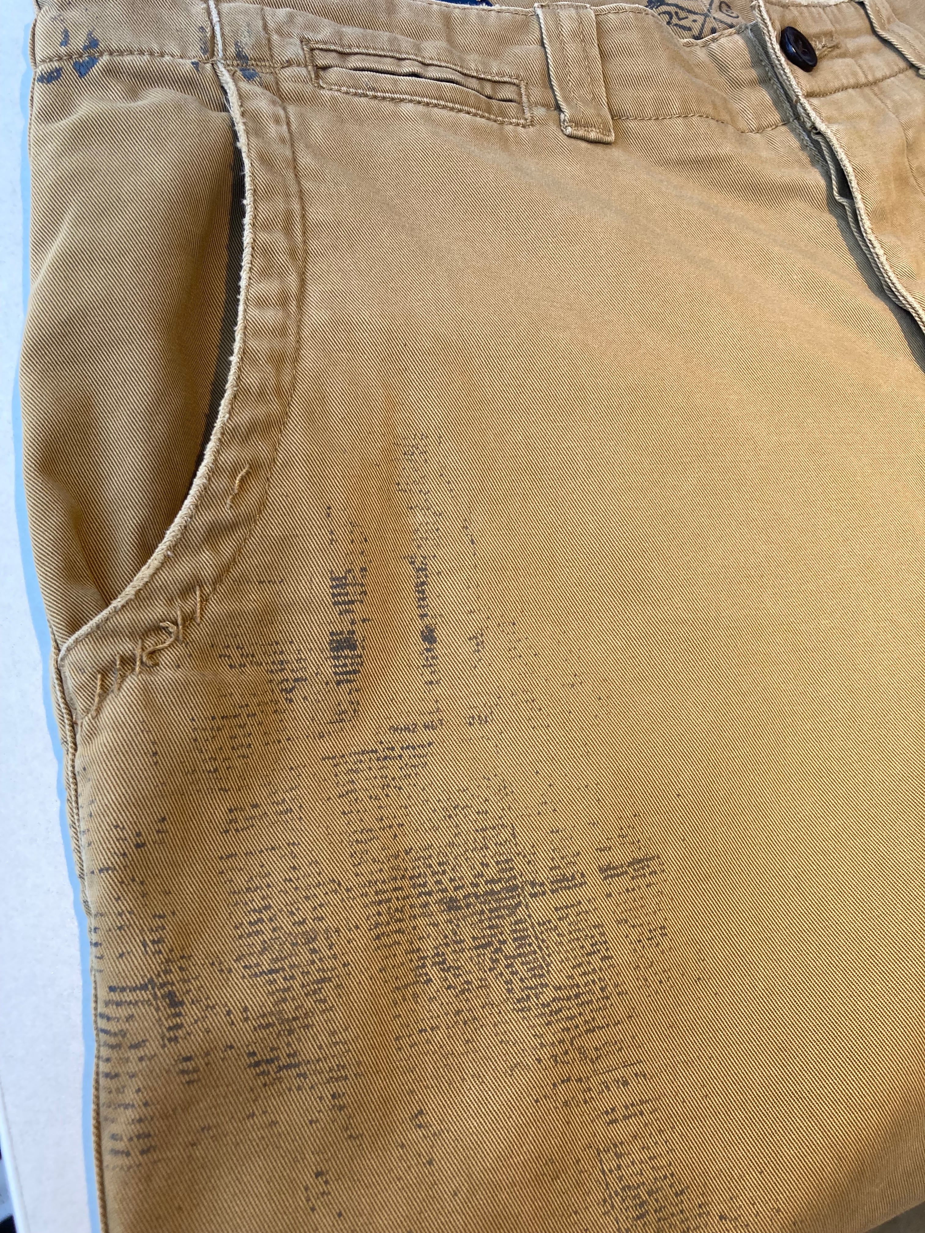 オリジナルの加工として、当て布リペア、タタキ、ペンキ擦れ加工とラルフの超絶技巧が散りばめられています。