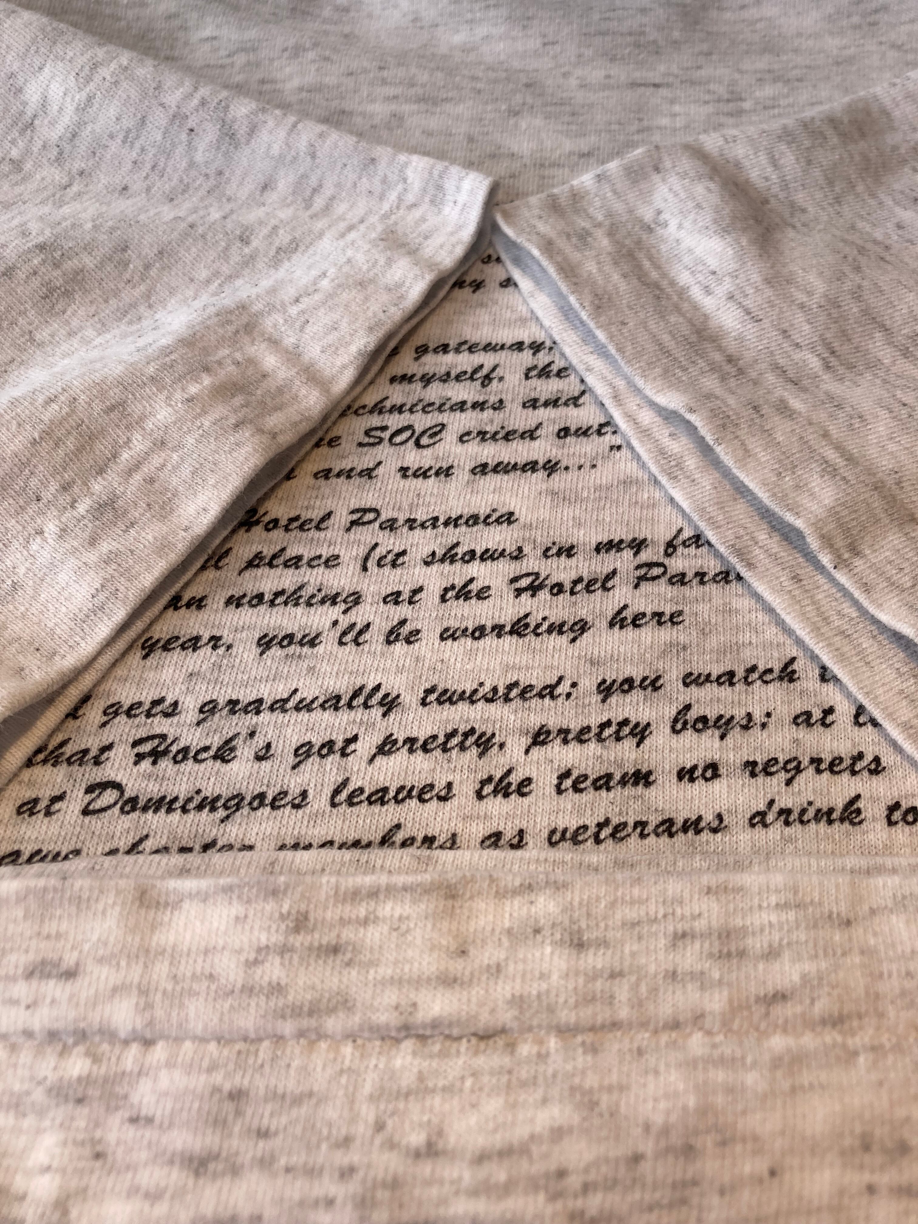 このデザインでピンと来た方は音楽ツウですね。EaglesのHotel California ネタのパロディーTシャツ。Hotel PARANOIAってJAZZ系のアーティストがいましたが、多分関係ない謎Tシャツ。